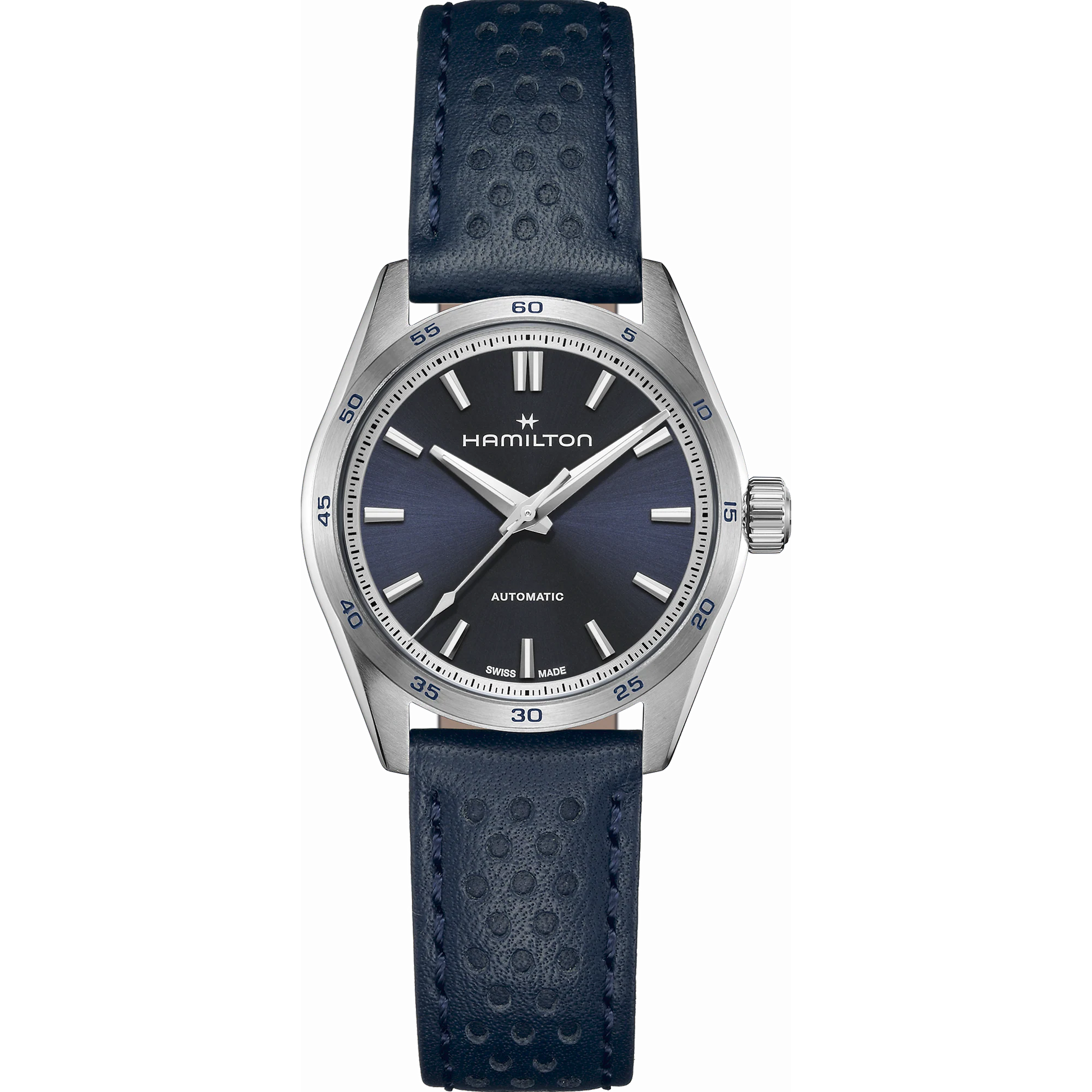 Made for those who favor function and style at once, the Jazzmaster Performer line offers a powerful sport-chic appearance. Powered by the H-10 automatic movement with 80 hours power reserve, this Jazzmaster Performer Automatic features a 34mm stainless steel case accented by an understated dark blue dial and a matching racing-style perforated blue leather strap.