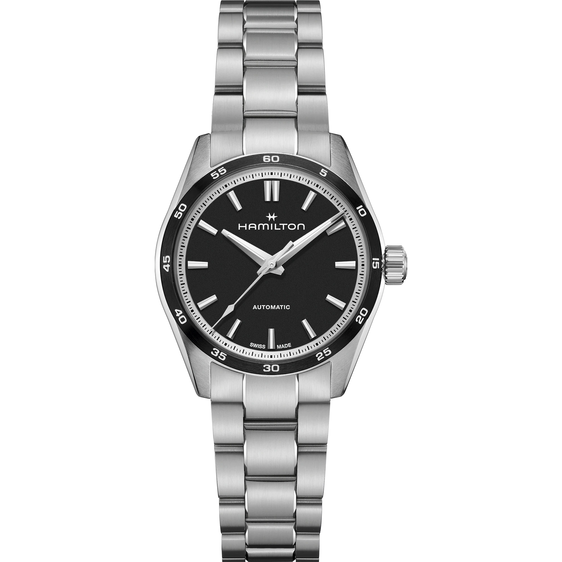 Made for those who favor function and style at once, the Jazzmaster Performer line offers a powerful sport-chic appearance. Powered by the H-10 automatic movement with 80 hours power reserve, this Jazzmaster Performer Automatic features a 34mm stainless steel case accented by an understated black dial and a refined stainless steel bracelet.