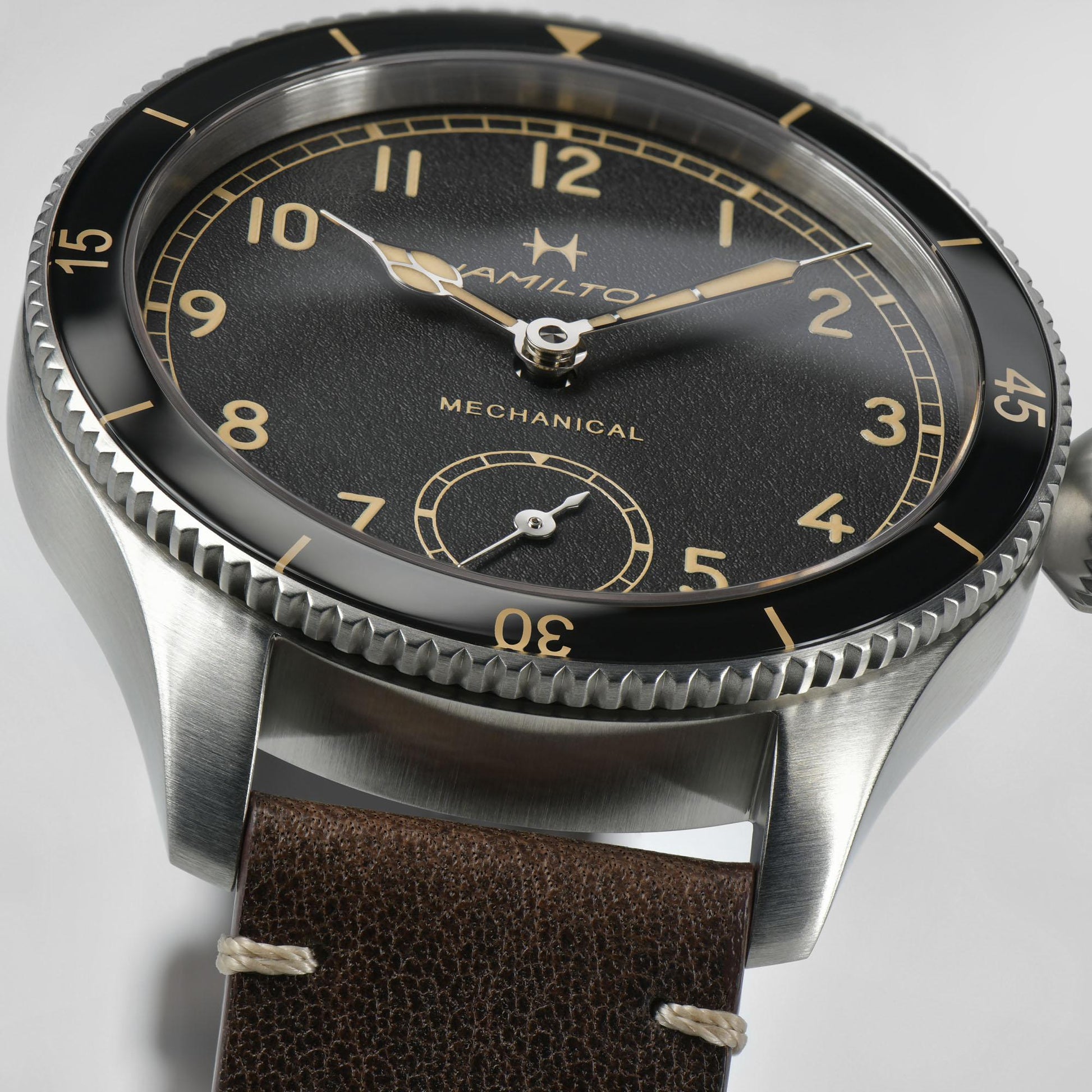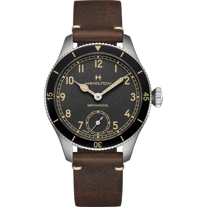 Features Reference H76719530 Caliber ETA 6498-1 Collection Khaki Aviation Movement Mechanical Case size 43mm Dial color Black Case material Stainless steel Crystal Sapphire Lug width 20mm Power reserve 50-hour power reserve Water Resistance 10 bar (100m) Open Case Back Yes -