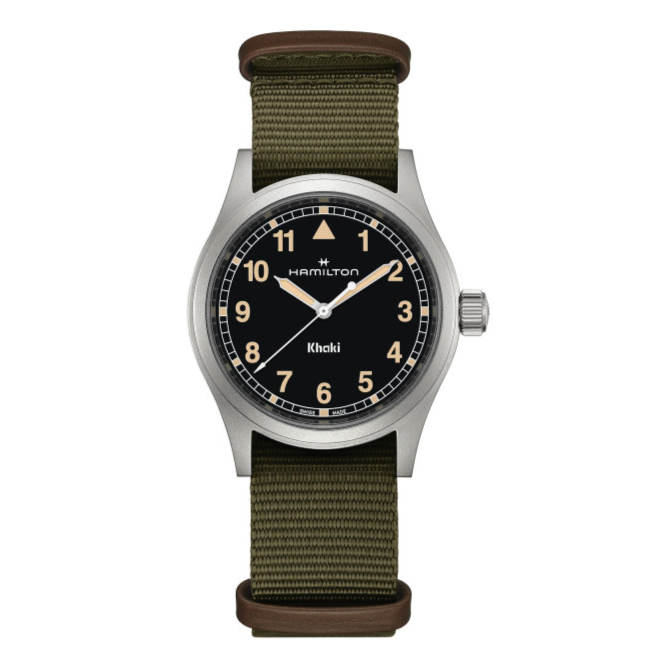 The Khaki Field Quartz expresses a return to Hamilton's military heritage through simplicity in design. The dial features a clear typography with straighter Arabic numerals and a "railway" minute track. The color palette is understated, with its sleek black dial highlighted by old radium-colored Super-LumiNova® indexes. The watch comes with a green textile NATO strap and brown leather loops - perfect for your next adventure out in the field.