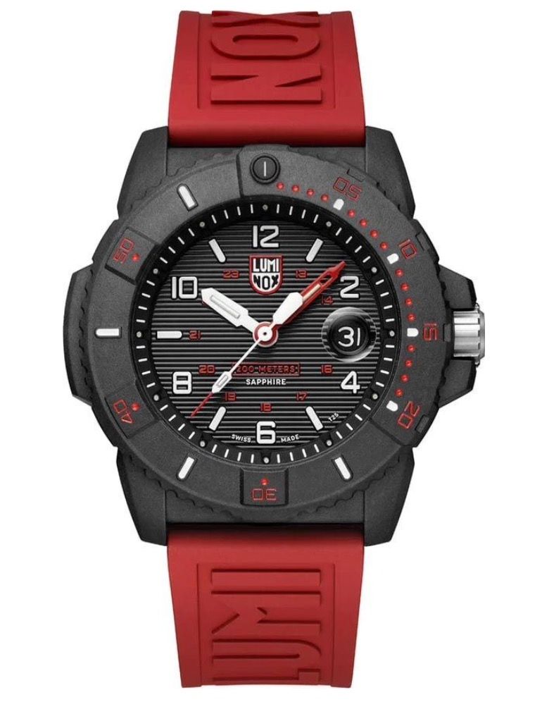 The Navy SEAL 3600 Series comes in different color variations, with this watch being the black with black and red accents, and features the new red cut-to-fit strap. It is a carbon-compound watch that features a hydraulically-stamped dial protected by a sapphire crystal with anti-reflective coating and a magnifier for the date display.