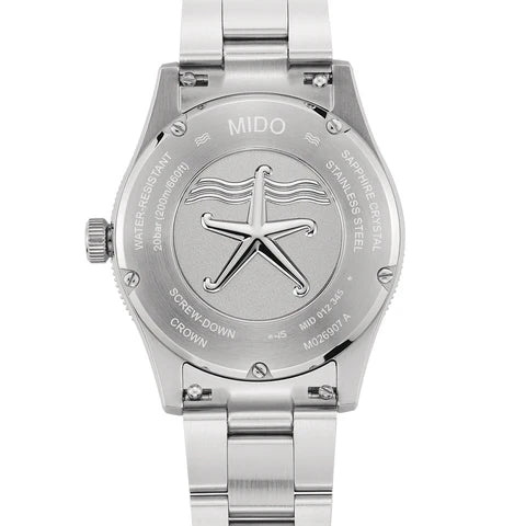 Get set for an adventure – on land or across the ocean, but always in great style! MIDO proposes what is undeniably its most versatile Ocean Star watch model, a sporty, reliable and chic companion for any escape. Its perfect 39 mm diameter, is combined with a beautifully slim case for the Ocean Star. The aesthetic of this automatic watch is defined as well by its unique and distinctive relief dial – evoking the movement of the currents across the sand. Water-resistant up to a pressure of 200 m (20 bars / 660 ft), the famous starfish motif - emblem of MIDO's historic watchmaking expertise in water-resistance - is featured on its screw-down case back.