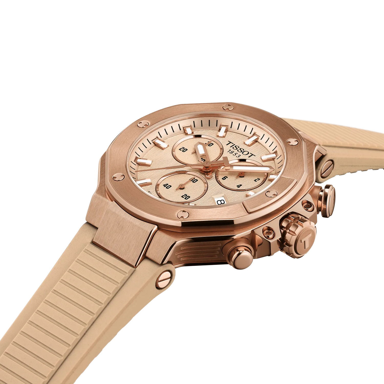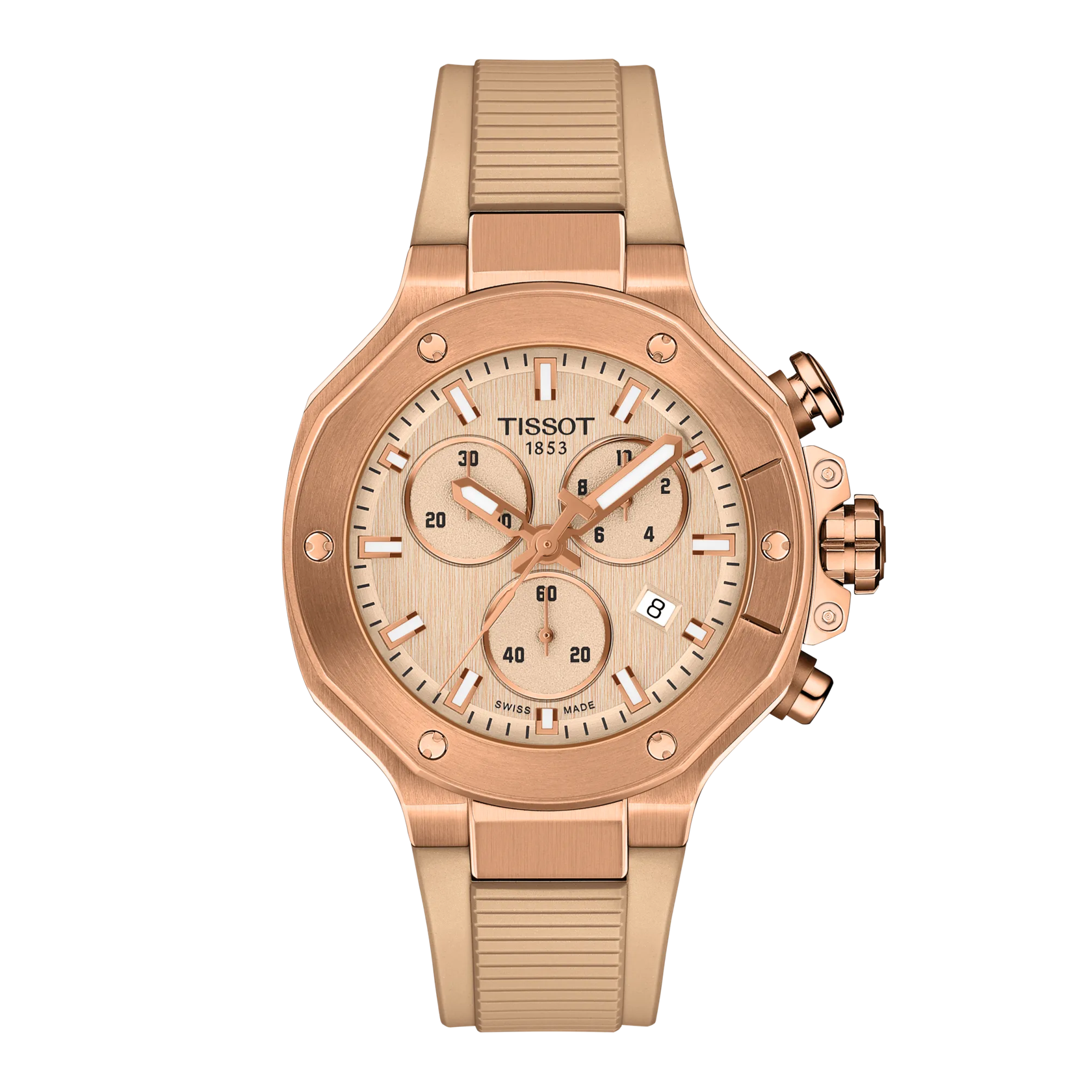 Tissot has drawn inspiration from its partnership with motorcycle racing to create a watch that reflects the dynamism of motorcycles and the emotion of the sport... The T-Race collection immerses the wearer in a mechanical environment and awakens the spirit. The bezel resembles a brake disc, the pushers are inspired by handlebars, and the cooling fins of an engine are reproduced on the side of the case. The watch is water-resistant to 10 bar (100 m) and equipped with a quartz chronograph movement.
