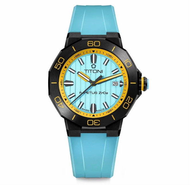 Unveiling a seamless blend of colorful high-tech ceramics, stainless steel, and a rubber strap, this timepiece exudes a daring avant-garde appeal, setting it apart as a true statement piece. The ceramic case ring, adorned with perfectly brushed colors and polished grooves, adds depth and dimension to its powerful aesthetic. Complementing the case, the crown features a ceramic pill, intricately engraved with the TITONI logo, harmoniously mirroring the case ring’s color.