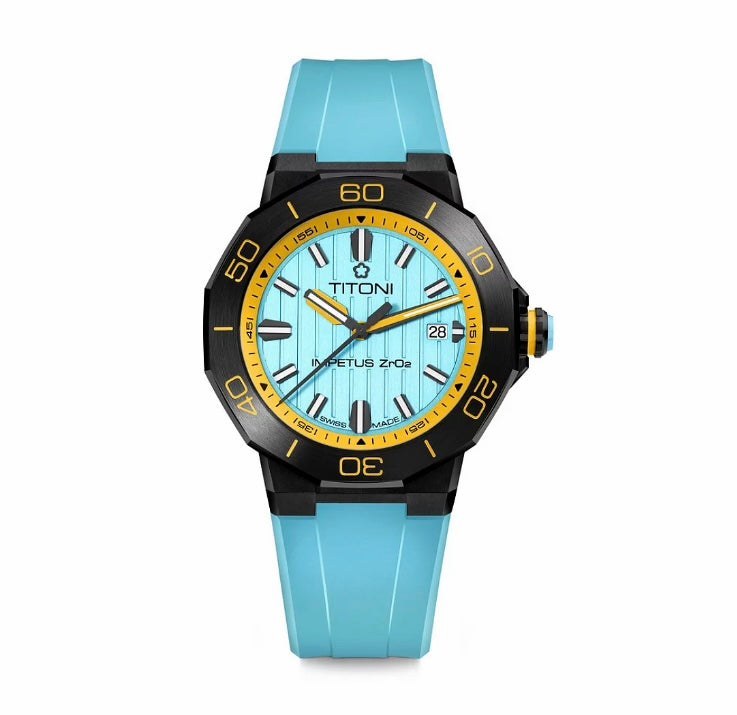Introducing the TITONI Impetus CeramTech Watch. This timepiece showcases the elegance of handcrafted precision, paired with the resilience of high-tech ceramic – a material celebrated for its lightweight nature and hypoallergenic properties. This watch promises not just a captivating design with vibrant color themes but also boasts unmatched scratch resistance.