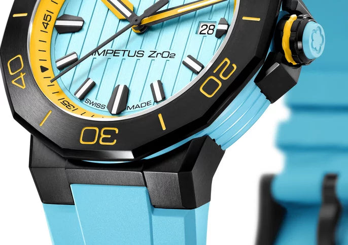 The Impetus CeramTech’s dial stands out with its vertical embossed lines, embodying the spirit of avant-garde design. The hands, accentuated with color-coordinated wings, ensure meticulous attention to detail in every aspect. A matching rubber strap, equipped with a quick-change system, completes the color theme and offers versatility, letting you effortlessly switch up your style.