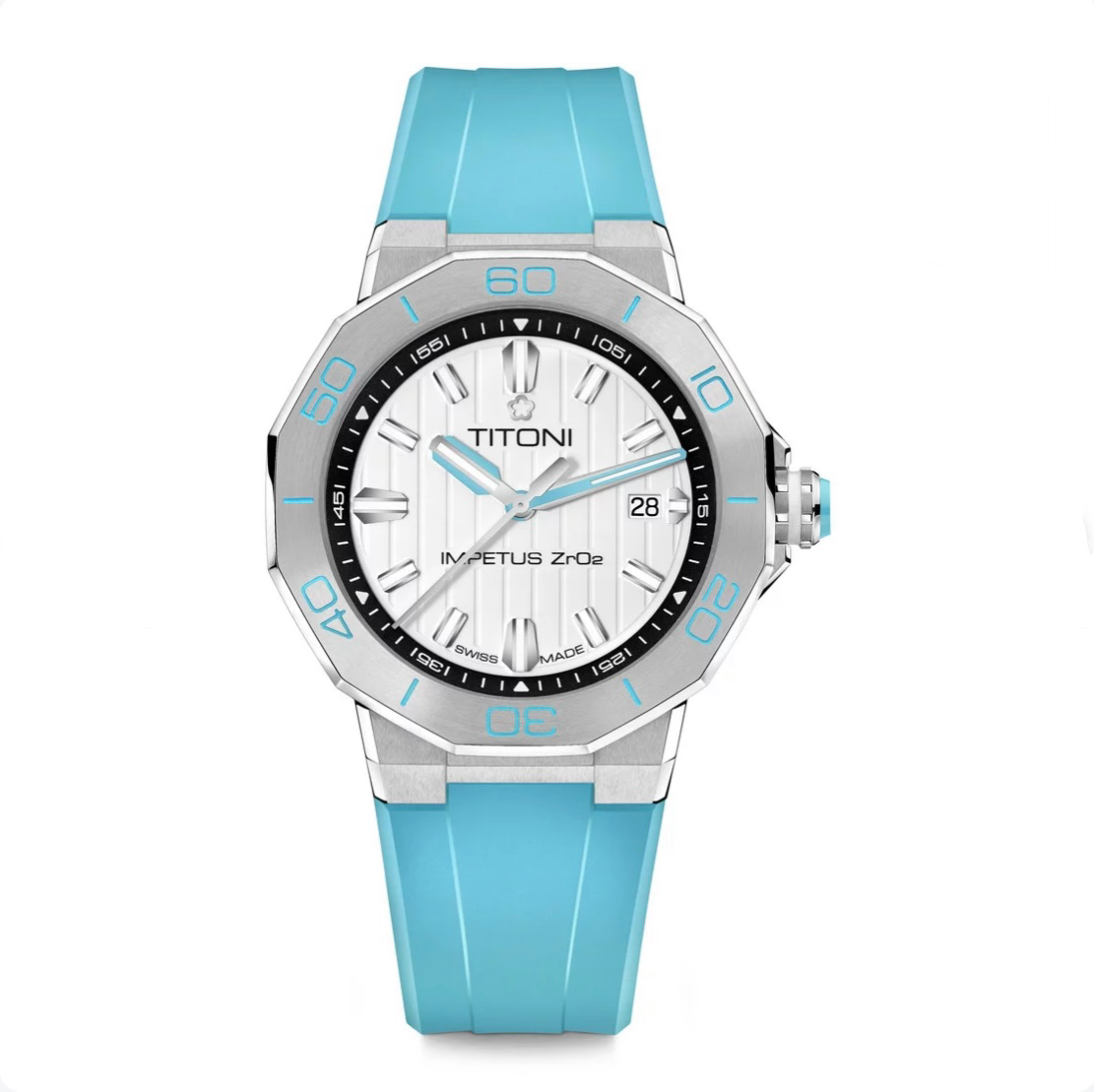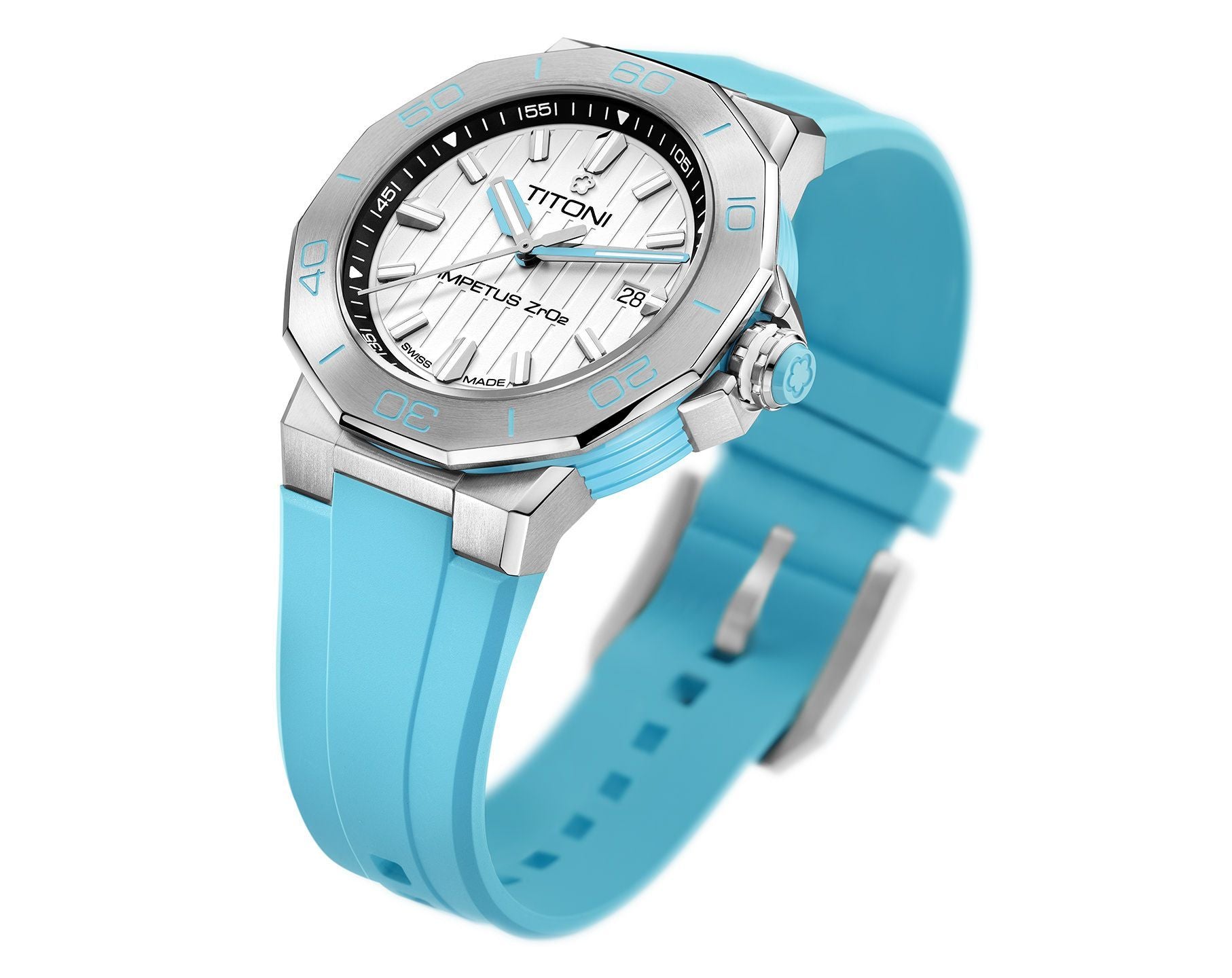 Unveiling a seamless blend of colorful high-tech ceramics, stainless steel, and a rubber strap, this timepiece exudes a daring avant-garde appeal, setting it apart as a true statement piece. The ceramic case ring, adorned with perfectly brushed colors and polished grooves, adds depth and dimension to its powerful aesthetic. Complementing the case, the crown features a ceramic pill, intricately engraved with the TITONI logo, harmoniously mirroring the case ring’s color.