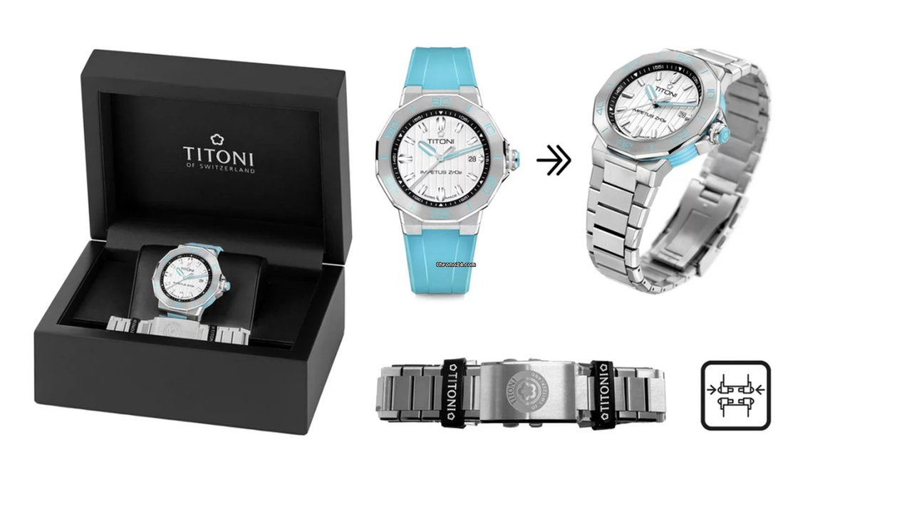 Each watch arrives in a beautifully designed box, complete with an interchangeable rubber strap and a stainless-steel bracelet featuring a single-fold buckle and precision adjustment system. Dive into the world of impeccable design and unmatched durability with the TITONI Impetus CeramTech Watch.