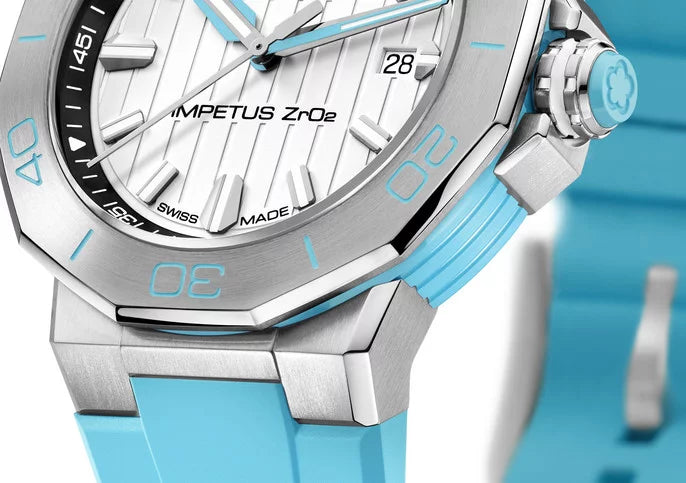 The Impetus CeramTech’s dial stands out with its vertical embossed lines, embodying the spirit of avant-garde design. The hands, accentuated with color-coordinated wings, ensure meticulous attention to detail in every aspect. A matching rubber strap, equipped with a quick-change system, completes the color theme and offers versatility, letting you effortlessly switch up your style.
