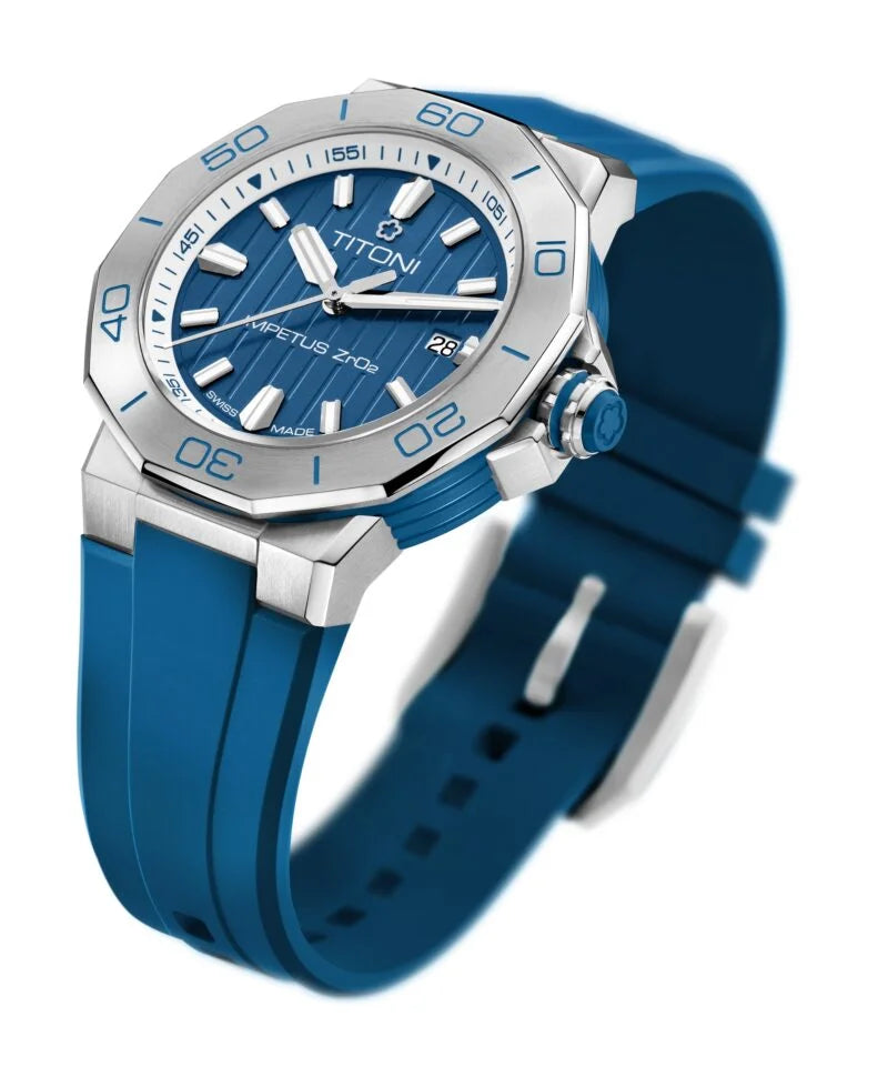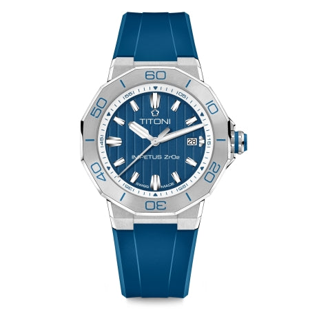 Each watch arrives in a beautifully designed box, complete with an interchangeable rubber strap and a stainless-steel bracelet featuring a single-fold buckle and precision adjustment system. Dive into the world of impeccable design and unmatched durability with the TITONI Impetus CeramTech Watch.