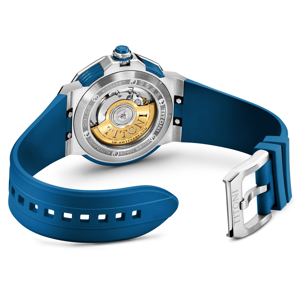 Unveiling a seamless blend of colorful high-tech ceramics, stainless steel, and a rubber strap, this timepiece exudes a daring avant-garde appeal, setting it apart as a true statement piece. The ceramic case ring, adorned with perfectly brushed colors and polished grooves, adds depth and dimension to its powerful aesthetic. Complementing the case, the crown features a ceramic pill, intricately engraved with the TITONI logo, harmoniously mirroring the case ring’s color.