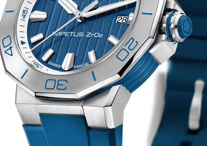 The Impetus CeramTech’s dial stands out with its vertical embossed lines, embodying the spirit of avant-garde design. The hands, accentuated with color-coordinated wings, ensure meticulous attention to detail in every aspect. A matching rubber strap, equipped with a quick-change system, completes the color theme and offers versatility, letting you effortlessly switch up your style.
