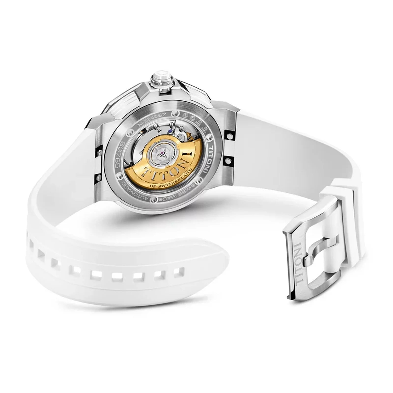Unveiling a seamless blend of colorful high-tech ceramics, stainless steel, and a rubber strap, this timepiece exudes a daring avant-garde appeal, setting it apart as a true statement piece. The ceramic case ring, adorned with perfectly brushed colors and polished grooves, adds depth and dimension to its powerful aesthetic. Complementing the case, the crown features a ceramic pill, intricately engraved with the TITONI logo, harmoniously mirroring the case ring’s color.