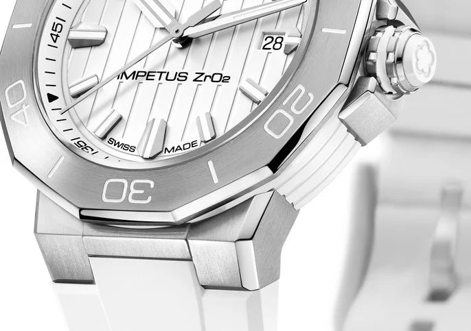 The Impetus CeramTech’s dial stands out with its vertical embossed lines, embodying the spirit of avant-garde design. The hands, accentuated with color-coordinated wings, ensure meticulous attention to detail in every aspect. A matching rubber strap, equipped with a quick-change system, completes the color theme and offers versatility, letting you effortlessly switch up your style.